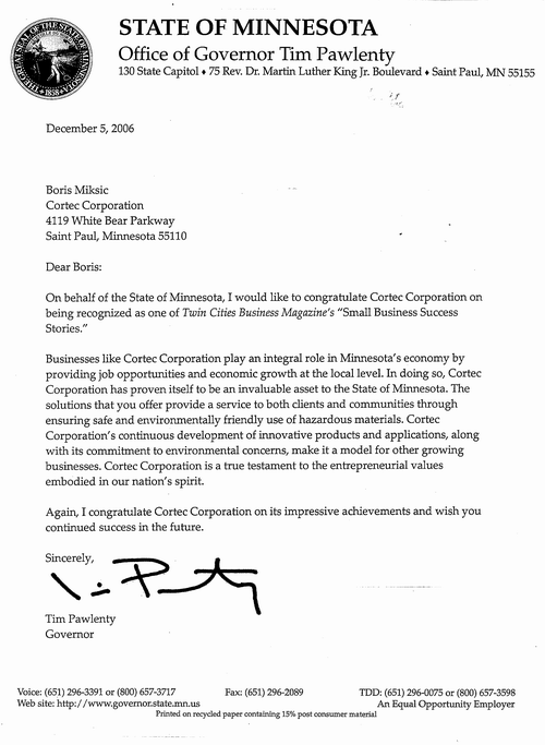 Cortec® Corporation is the 2003 Winner of the Governor Pawlenty’s International Trade