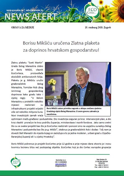 Ovo lansiranje predstavlja novi veliki uspjeh EcoCorteca, hrvatskog proizvođača antikorozivnih folija i vrećica. Kompleks tvornica u Baranji, koji je nedavno proslavio 20 godina od otvaranja, postao je svjetski poznat po VpCI® ekološkim inovacijama za pakiranje i posvećenosti kružnoj ekonomiji. Ono što je započelo kao Mikšićeva ambiciozna ideja, danas je najmoderniji europski industrijski kompleks antikorozivnog pakiranja u kojem se krug ne samo otvara, već i potpuno zatvara. EcoCortec je usavršio model kružnog gospodarstva u kojem se stara folija prikuplja, reciklira i ponovno rađa u pogonima Belog Manastira, proces za koji su upravo ove jeseni primili prestižnu njemačku nagradu za ambalažu (German Packaging Award).