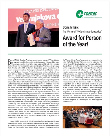 Boris Miksic, a Croatian-American entrepreneur and owner of Cortec® Corporation, has received special recognition for 50 years of dedicated work at NACE International, the largest global organization focusing on developing standards for corrosion prevention. Cortec® is a global corrosion inhibitor manufacturer and a leader in green corrosion protection technologies. This valuable recognition confirms Mr. Miksic as one of the leading global experts in the field of VCI/VpCI corrosion inhibitors. Patented Vapor phase Corrosion Inhibitors are revolutionary technology that simplifies corrosion protection and is ideal for keeping enclosed void spaces such as packages, equipment internals, or structural metal cavities, corrosion-free. This technology is designed to save time, money and offer more thorough, reliable, and easier-to-use protection than a variety of other metals preservation strategies.