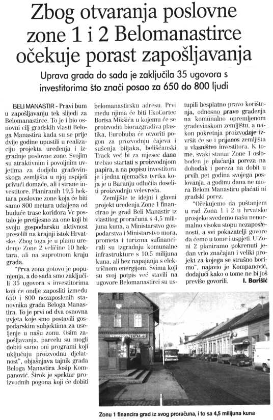 Zbog otvaranja poslovne zone 1 i 2 Belomanastirce očekuje porast zapošljavanja