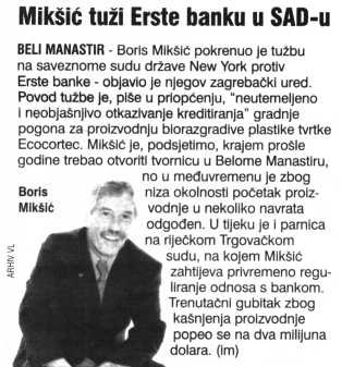 Mikšić tuži Erste banku u SAD-u