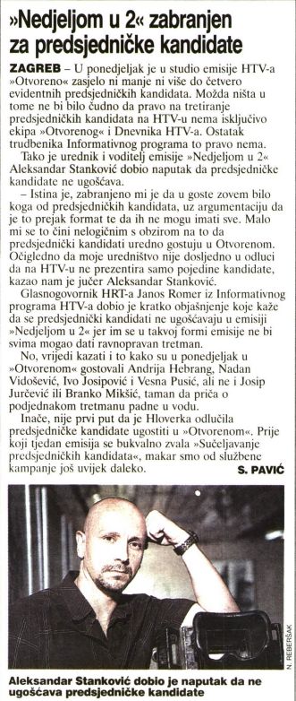 "Nedjeljom u 2" zabranjen za predsjedničke kandidate