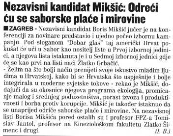 Nezavisni kandidat Mikšić: Odreć?i ću se saborske plaće i mirovine