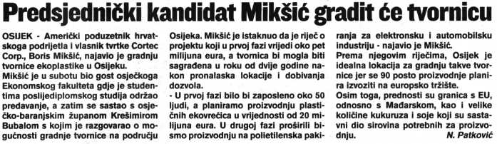 Predsjednicki kandidat Mikšic gradit ce tvornicu
