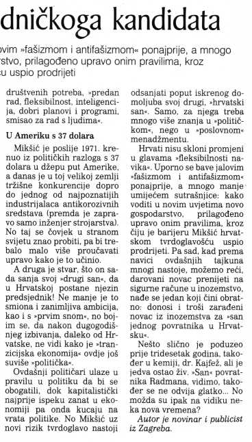 Drugi, 'hrvatski san', predsjedničkoga kandidata