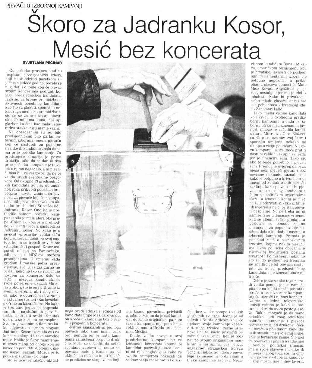 Škoro za Jadranku Kosor, Mesić bez koncerata