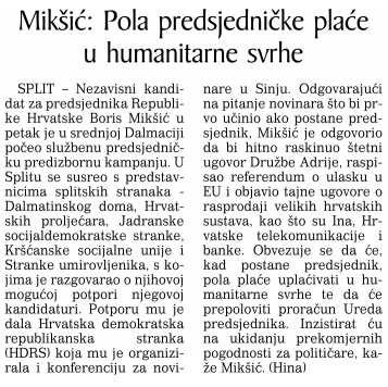 Mikšic: Pola predsjednicke place u humanitarne svrhe