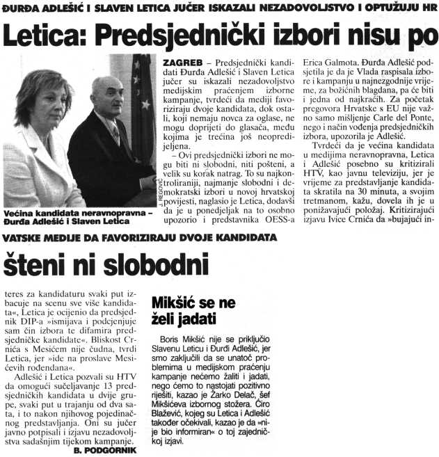 Letica: Predsjednički izbori nisu pošteni ni slobodni (isto u GS, GI)