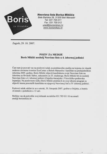 Čast nam je pozvati vas na poslovni ručak te objavu kandidature koji će se održati u utorak, 30.10.2007. godine u Osijeku, u hotelu "Central" s početkom u 12 sati!